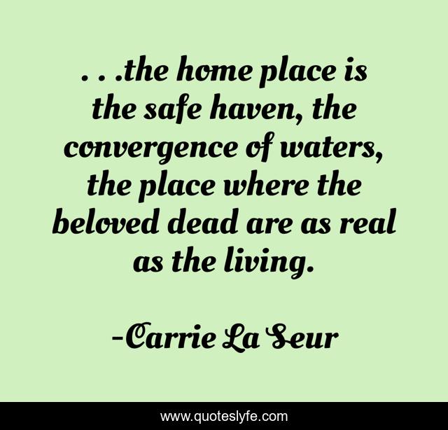 This page presents the quote ". . .the home place is the safe haven, the convergence of waters, the place where the beloved dead are as real as the living.". Author of this quote is Carrie La Seur. .