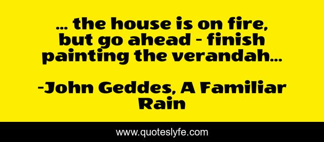 This page presents the quote "... the house is on fire, but go ahead - finish painting the verandah...". Author of this quote is John Geddes, A Familiar Rain. This quote is about fire, house, painting, sarcasm-humor, verandah,.