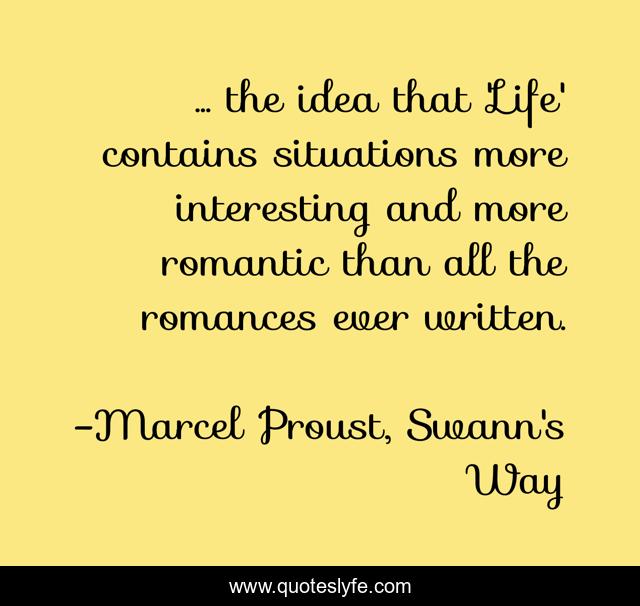 This page presents the quote "... the idea that 'Life' contains situations more interesting and more romantic than all the romances ever written.". Author of this quote is Marcel Proust, Swann's Way. This quote is about romance, life,.