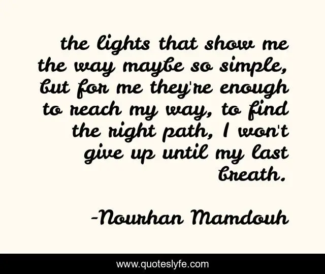 This page presents the quote "the lights that show me the way maybe so simple, but for me they're enough to reach my way, to find the right path, I won't give up until my last breath.". Author of this quote is Nourhan Mamdouh. .