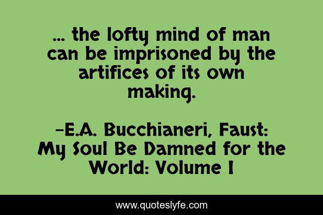 This page presents the quote "... the lofty mind of man can be imprisoned by the artifices of its own making.". Author of this quote is E.A. Bucchianeri, Faust: My Soul Be Damned for the World: Volume I. This quote is about marlowe, imprison, faustian, christopher-marlowe, faustus, grand-plans, when-things-fall-apart, imprisionment, mind,.
