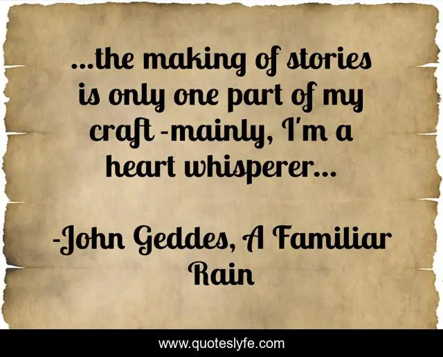This page presents the quote "...the making of stories is only one part of my craft -mainly, I'm a heart whisperer...". Author of this quote is John Geddes, A Familiar Rain. This quote is about heart, craft, writer, stories, whisperer,.
