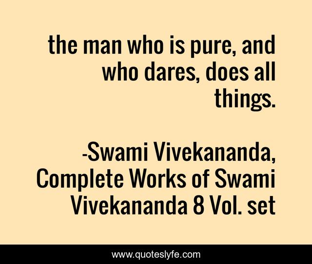 This page presents the quote "the man who is pure, and who dares, does all things.". Author of this quote is Swami Vivekananda, Complete Works of Swami Vivekananda 8 Vol. set. .