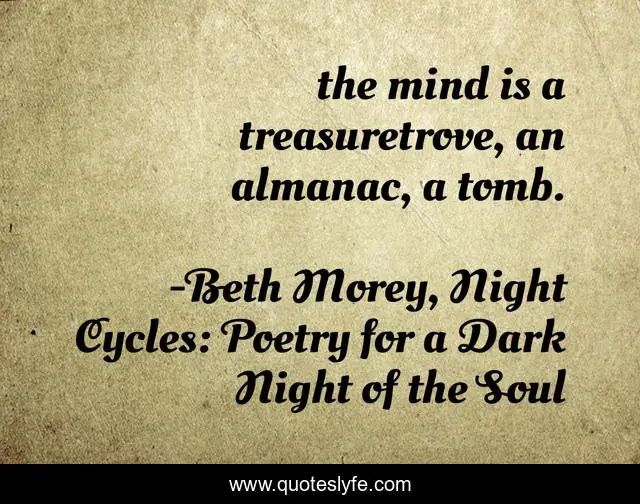 This page presents the quote "the mind is a treasuretrove, an almanac, a tomb.". Author of this quote is Beth Morey, Night Cycles: Poetry for a Dark Night of the Soul. This quote is about poem, death, mind, poetry, grief, brain, dark,.