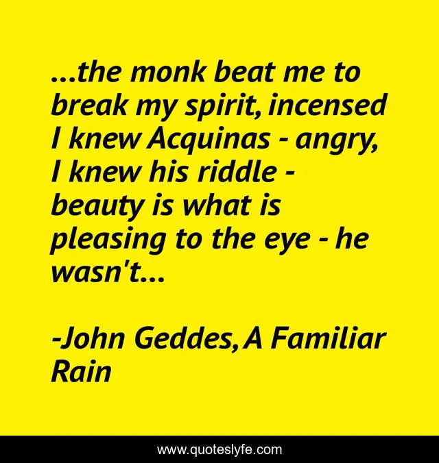 This page presents the quote "...the monk beat me to break my spirit, incensed I knew Acquinas - angry, I knew his riddle - beauty is what is pleasing to the eye - he wasn't...". Author of this quote is John Geddes, A Familiar Rain. This quote is about acquinas, priest, monk, spirit, beatings,.