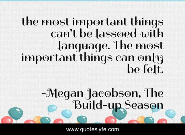 This page presents the quote "the most important things can't be lassoed with language. The most important things can only be felt.". Author of this quote is Megan Jacobson, The Build-up Season. This quote is about australian-literature, language, megan-jacobson, aussie-author, important-things, feelings,.