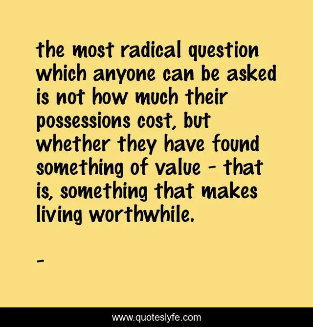 This page presents the quote "the most radical question which anyone can be asked is not how much their possessions cost, but whether they have found something of value - that is, something that makes living worthwhile.". Author of this quote is . This quote is about enthusiasm, meaning-of-life, inspirational,.