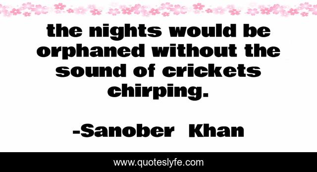 This page presents the quote "the nights would be orphaned without the sound of crickets chirping.". Author of this quote is Sanober Khan. This quote is about nights, magic, nature, night-sounds, nature-lover, night-time, chirping, nature-s-beauty,.