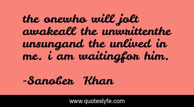 This page presents the quote "the onewho will jolt awakeall the unwrittenthe unsungand the unlived in me. i am waitingfor him.". Author of this quote is Sanober Khan. This quote is about love, destiny, hopeless-romantic, love-sayings, soulmates, poetry, fairy-tale, dream-man, affection,.