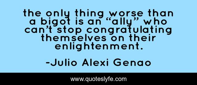 This page presents the quote "the only thing worse than a bigot is an “ally” who can’t stop congratulating themselves on their enlightenment.". Author of this quote is Julio Alexi Genao. This quote is about lgbt, appropriation, allies,.