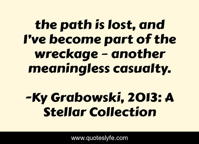 This page presents the quote "the path is lost, and I’ve become part of the wreckage − another meaningless casualty.". Author of this quote is Ky Grabowski, 2013: A Stellar Collection. This quote is about hope-and-despair, loneliness, emptiness, sadness,.