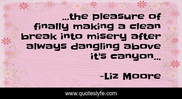 This page presents the quote "...the pleasure of finally making a clean break into misery after always dangling above it's canyon...". Author of this quote is Liz Moore. .