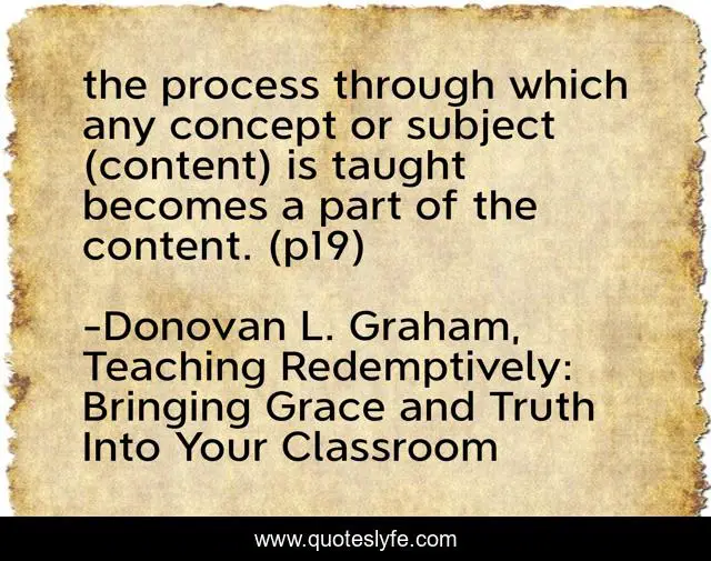 This page presents the quote "the process through which any concept or subject (content) is taught becomes a part of the content. (p19)". Author of this quote is Donovan L. Graham, Teaching Redemptively: Bringing Grace and Truth Into Your Classroom. This quote is about teaching, education, learning,.
