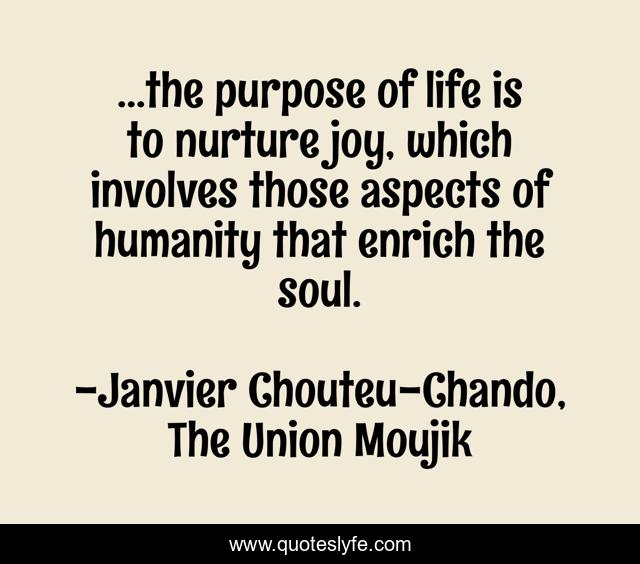 This page presents the quote "…the purpose of life is to nurture joy, which involves those aspects of humanity that enrich the soul.". Author of this quote is Janvier Chouteu-Chando, The Union Moujik. This quote is about joy, life, love, happiness, affection,.