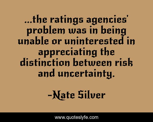 This page presents the quote "...the ratings agencies' problem was in being unable or uninterested in appreciating the distinction between risk and uncertainty.". Author of this quote is Nate Silver. This quote is about ratings, uncertainty, prediction, risk,.