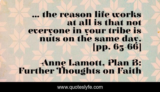 This page presents the quote "... the reason life works at all is that not everyone in your tribe is nuts on the same day. [pp. 65-66]". Author of this quote is Anne Lamott, Plan B: Further Thoughts on Faith. This quote is about insane, sanity, crazy, nuts, tribe,.