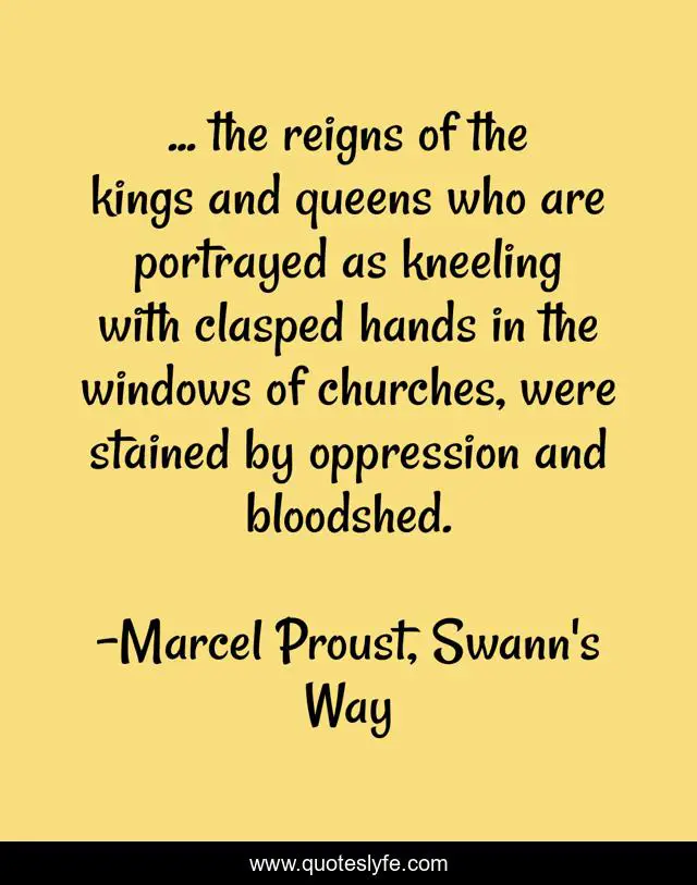 This page presents the quote "... the reigns of the kings and queens who are portrayed as kneeling with clasped hands in the windows of churches, were stained by oppression and bloodshed.". Author of this quote is Marcel Proust, Swann's Way. This quote is about religion, oppression, bloodshed,.