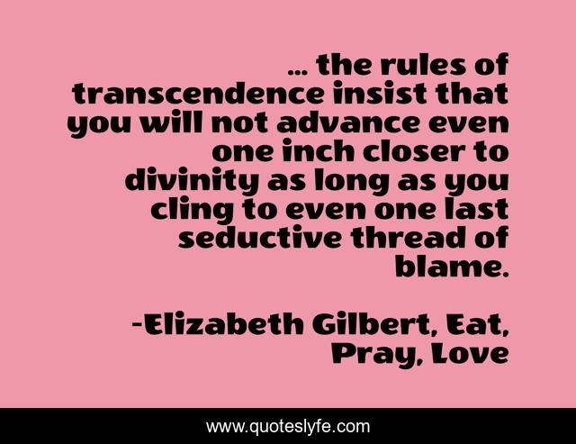 This page presents the quote "... the rules of transcendence insist that you will not advance even one inch closer to divinity as long as you cling to even one last seductive thread of blame.". Author of this quote is Elizabeth Gilbert, Eat, Pray, Love. This quote is about blame, spirituality, divinity, transcendence,.