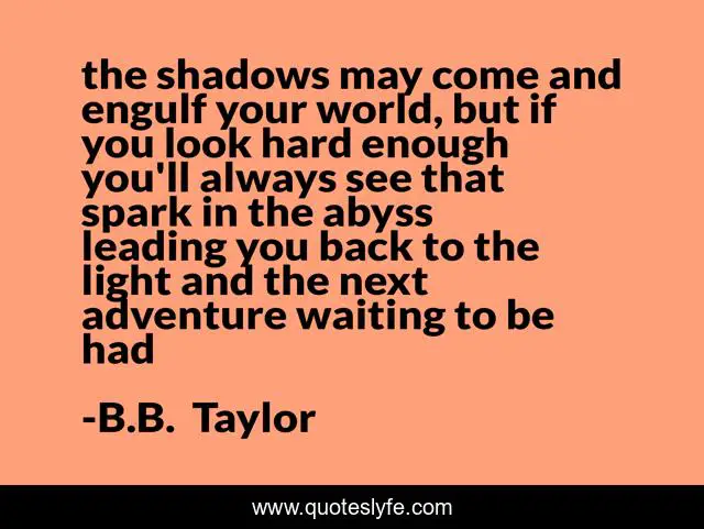 This page presents the quote "the shadows may come and engulf your world, but if you look hard enough you'll always see that spark in the abyss leading you back to the light and the next adventure waiting to be had". Author of this quote is B.B. Taylor. This quote is about fantasy, inspirational, light-and-darkness, enthusiasm,.