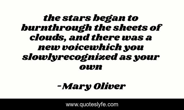 This page presents the quote "the stars began to burnthrough the sheets of clouds, and there was a new voicewhich you slowlyrecognized as your own". Author of this quote is Mary Oliver. .