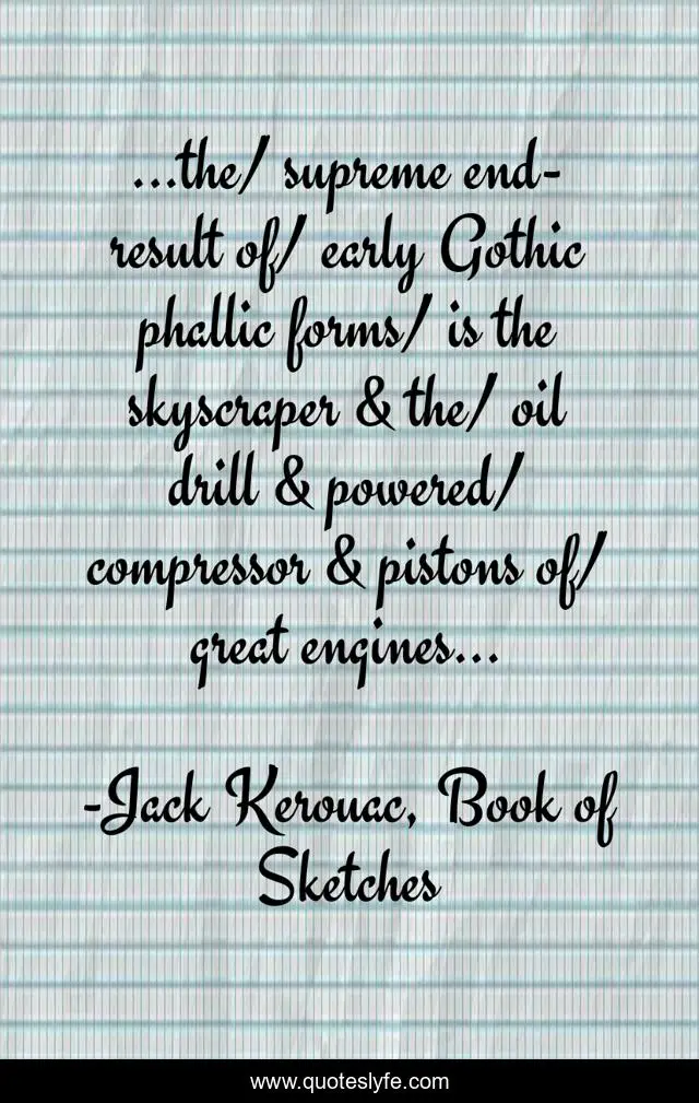 This page presents the quote "...the/ supreme end-result of/ early Gothic phallic forms/ is the skyscraper & the/ oil drill & powered/ compressor & pistons of/ great engines...". Author of this quote is Jack Kerouac, Book of Sketches. This quote is about city, civilization, skyscraper,.