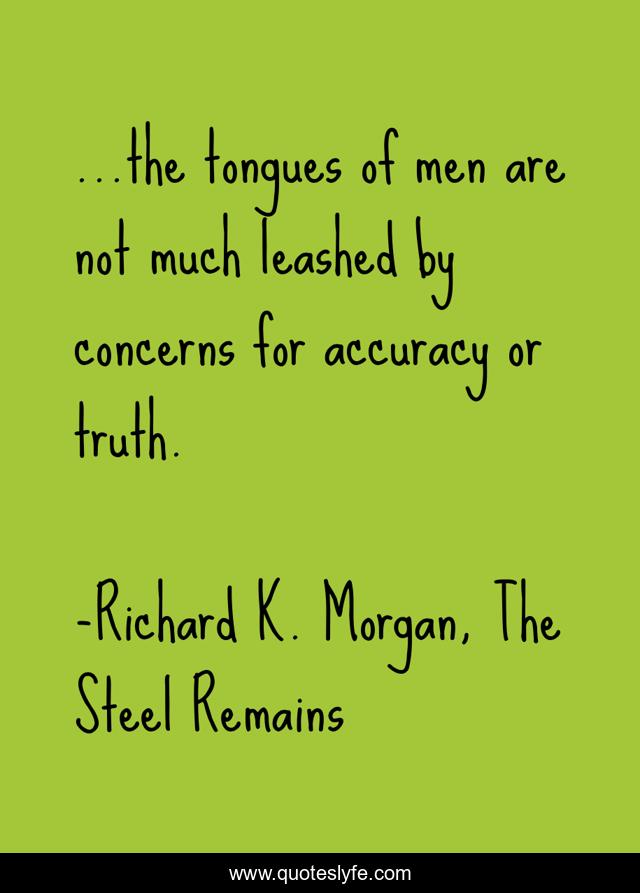 This page presents the quote "...the tongues of men are not much leashed by concerns for accuracy or truth.". Author of this quote is Richard K. Morgan, The Steel Remains. .