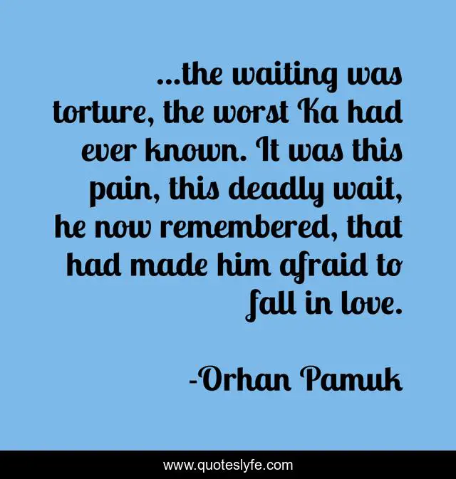 This page presents the quote "...the waiting was torture, the worst Ka had ever known. It was this pain, this deadly wait, he now remembered, that had made him afraid to fall in love.". Author of this quote is Orhan Pamuk. This quote is about longing, waiting, love, affection, pain,.