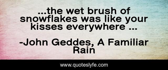 This page presents the quote "...the wet brush of snowflakes was like your kisses everywhere ...". Author of this quote is John Geddes, A Familiar Rain. This quote is about kisses, love, poetry, affection, snowflakes,.
