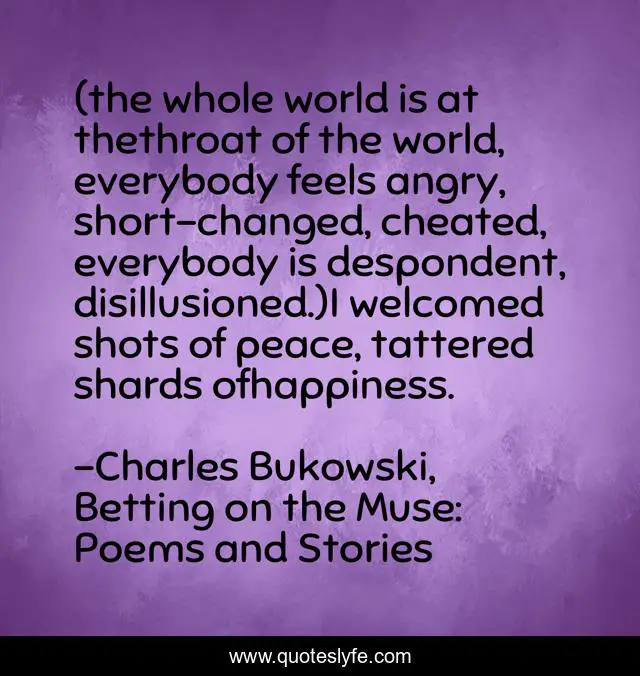 This page presents the quote "(the whole world is at thethroat of the world, everybody feels angry, short-changed, cheated, everybody is despondent, disillusioned.)I welcomed shots of peace, tattered shards ofhappiness.". Author of this quote is Charles Bukowski, Betting on the Muse: Poems and Stories. This quote is about anger, world, happiness, inspirational, enthusiasm,.