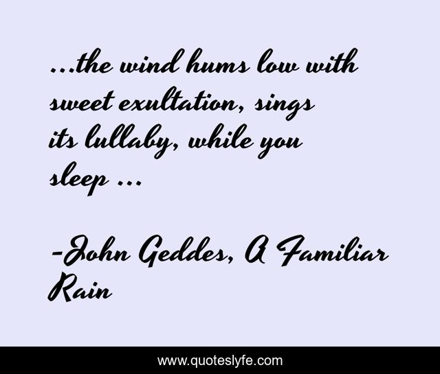 This page presents the quote "...the wind hums low with sweet exultation, sings its lullaby, while you sleep ...". Author of this quote is John Geddes, A Familiar Rain. This quote is about sings, lullaby, exultation, poetry, sleep, wind,.