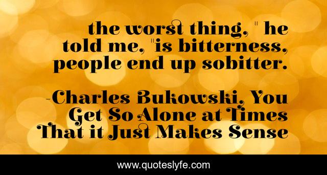 This page presents the quote "the worst thing, " he told me, "is bitterness, people end up sobitter.". Author of this quote is Charles Bukowski, You Get So Alone at Times That it Just Makes Sense. This quote is about poem, individuality, death, love, in-the-end, self, life, bitterness, soul,.