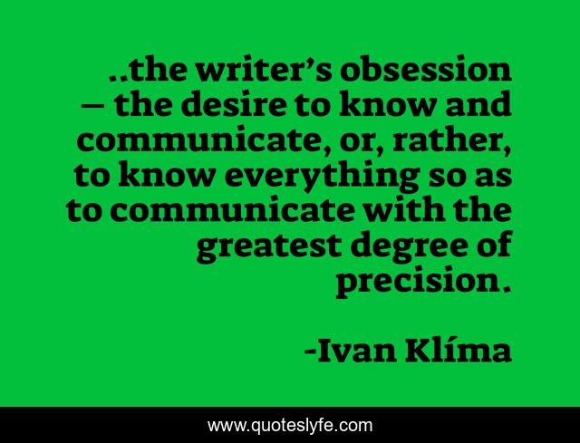 This page presents the quote "..the writer’s obsession – the desire to know and communicate, or, rather, to know everything so as to communicate with the greatest degree of precision.". Author of this quote is Ivan Klíma. This quote is about literature, creativity, writers, writing,.