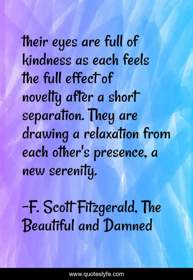 This page presents the quote "their eyes are full of kindness as each feels the full effect of novelty after a short separation. They are drawing a relaxation from each other's presence, a new serenity.". Author of this quote is F. Scott Fitzgerald, The Beautiful and Damned. This quote is about friends, friendship, separation,.