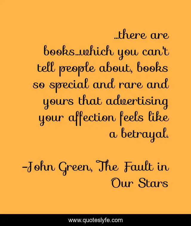 This page presents the quote "...there are books...which you can't tell people about, books so special and rare and yours that advertising your affection feels like a betrayal.". Author of this quote is John Green, The Fault in Our Stars. This quote is about john-green, the-fault-in-our-stars, protagonist, hazel, fiction,.