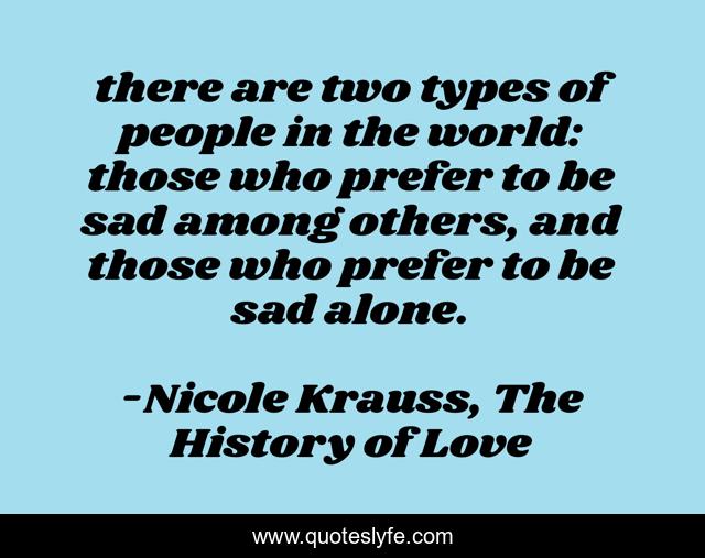This page presents the quote "there are two types of people in the world: those who prefer to be sad among others, and those who prefer to be sad alone.". Author of this quote is Nicole Krauss, The History of Love. This quote is about sadness, comfort, sad,.