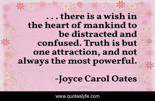 This page presents the quote ". . . there is a wish in the heart of mankind to be distracted and confused. Truth is but one attraction, and not always the most powerful.". Author of this quote is Joyce Carol Oates. This quote is about justice, willful-ignorance, rape-a-love-story, truth,.