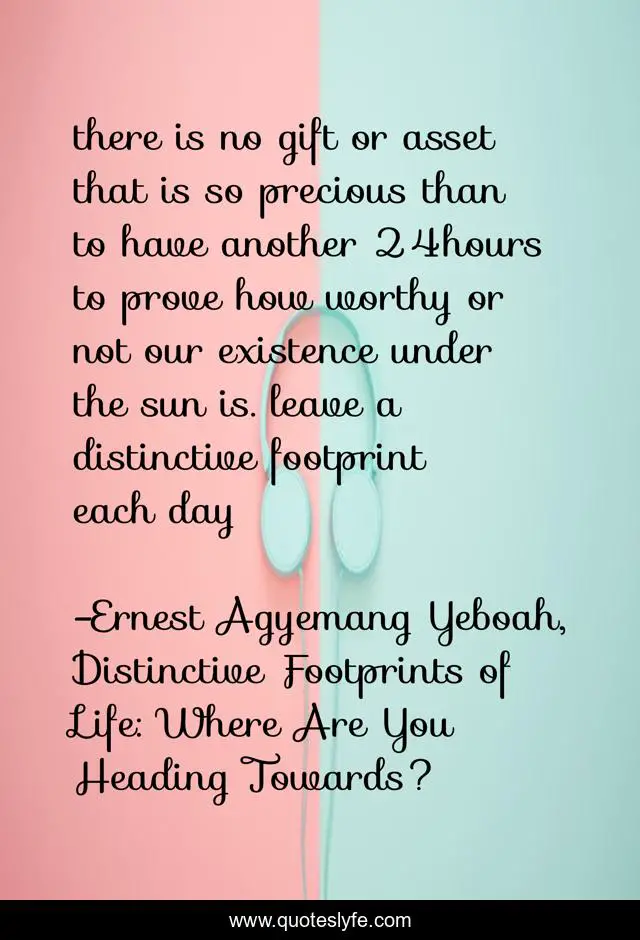 This page presents the quote "there is no gift or asset that is so precious than to have another 24hours to prove how worthy or not our existence under the sun is. leave a distinctive footprint each day". Author of this quote is Ernest Agyemang Yeboah, Distinctive Footprints of Life: Where Are You Heading Towards?. This quote is about footprints-in-life, footprints, wisdom, purpose, inspirational, enthusiasm,.