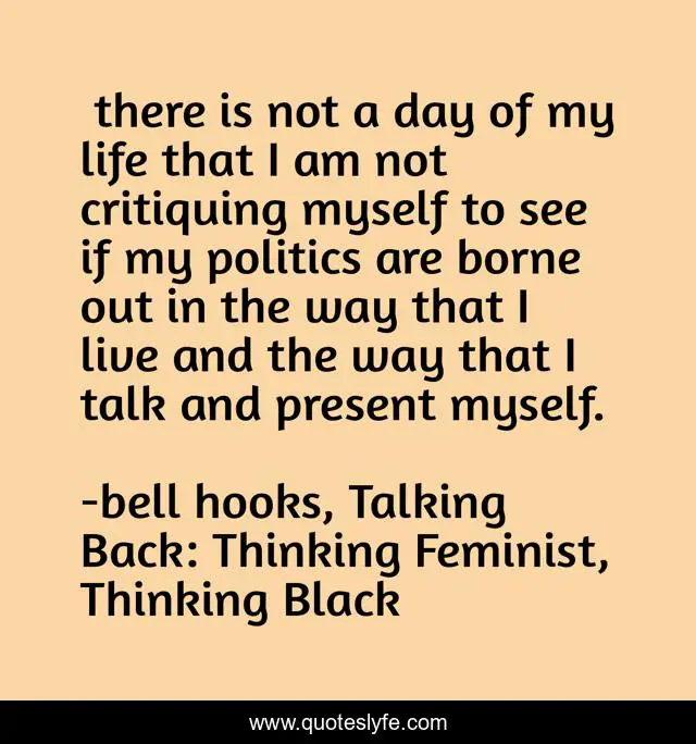 This page presents the quote "…there is not a day of my life that I am not critiquing myself to see if my politics are borne out in the way that I live and the way that I talk and present myself.". Author of this quote is bell hooks, Talking Back: Thinking Feminist, Thinking Black. This quote is about introspection, politics,.