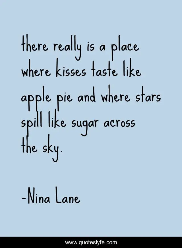 This page presents the quote "there really is a place where kisses taste like apple pie and where stars spill like sugar across the sky.". Author of this quote is Nina Lane. This quote is about romance, protective, steamy,.