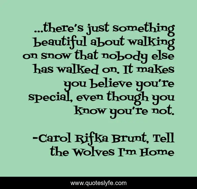 This page presents the quote "…there’s just something beautiful about walking on snow that nobody else has walked on. It makes you believe you’re special, even though you know you’re not.". Author of this quote is Carol Rifka Brunt, Tell the Wolves I'm Home. This quote is about beautiful, snow, june-elbus, tell-the-wolves-i-m-home, walking-on-snow, special,.