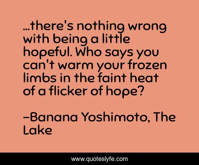 This page presents the quote "...there's nothing wrong with being a little hopeful. Who says you can't warm your frozen limbs in the faint heat of a flicker of hope?". Author of this quote is Banana Yoshimoto, The Lake. .