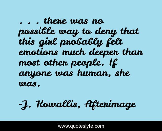 This page presents the quote ". . . there was no possible way to deny that this girl probably felt emotions much deeper than most other people. If anyone was human, she was.". Author of this quote is J. Kowallis, Afterimage. This quote is about novel, humanity, science-fiction, emotions,.