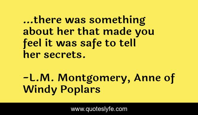 This page presents the quote "…there was something about her that made you feel it was safe to tell her secrets.". Author of this quote is L.M. Montgomery, Anne of Windy Poplars. This quote is about l-m-montgomery, secrets,.