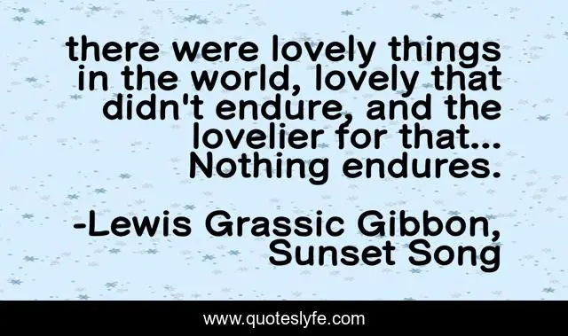 This page presents the quote "there were lovely things in the world, lovely that didn't endure, and the lovelier for that... Nothing endures.". Author of this quote is Lewis Grassic Gibbon, Sunset Song. This quote is about scotland, beauty,.