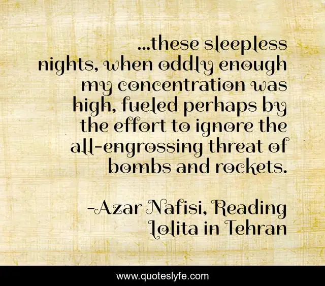 This page presents the quote "...these sleepless nights, when oddly enough my concentration was high, fueled perhaps by the effort to ignore the all-engrossing threat of bombs and rockets.". Author of this quote is Azar Nafisi, Reading Lolita in Tehran. This quote is about perseverance, war,.