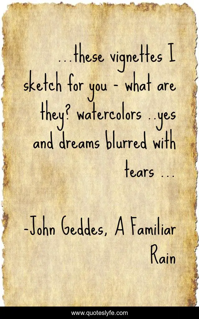 This page presents the quote "...these vignettes I sketch for you - what are they? watercolors ..yes and dreams blurred with tears ...". Author of this quote is John Geddes, A Familiar Rain. This quote is about sketches, vignettes, poetry, love-loss, tears, watercolors, dreams,.