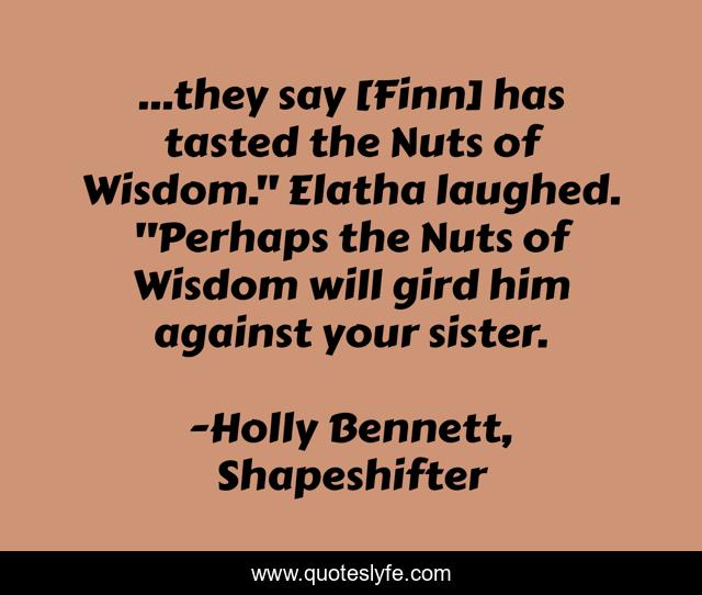 This page presents the quote "...they say [Finn] has tasted the Nuts of Wisdom." Elatha laughed. "Perhaps the Nuts of Wisdom will gird him against your sister.". Author of this quote is Holly Bennett, Shapeshifter. This quote is about humourous, nuts, wisdom,.