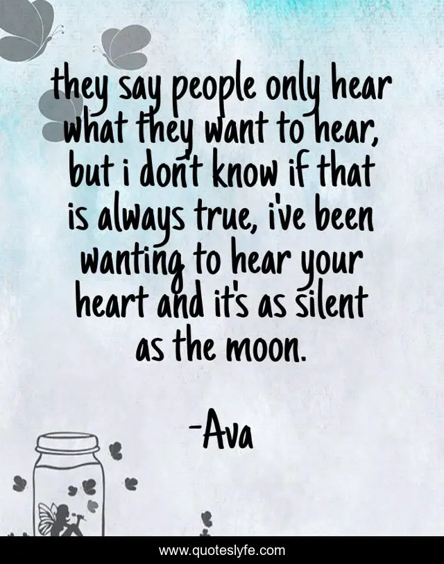 This page presents the quote "they say people only hear what they want to hear, but i don't know if that is always true, i've been wanting to hear your heart and it's as silent as the moon.". Author of this quote is Ava. This quote is about heart, love, human-nature, poetry, moon, quotes, human, prose, poems,.