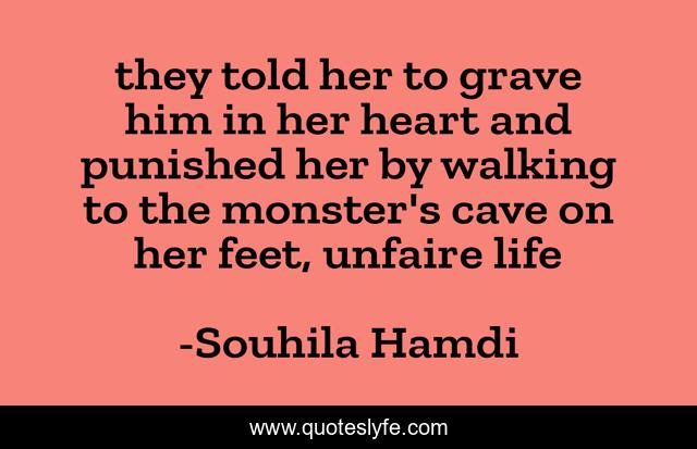 This page presents the quote "they told her to grave him in her heart and punished her by walking to the monster's cave on her feet, unfaire life". Author of this quote is Souhila Hamdi. .