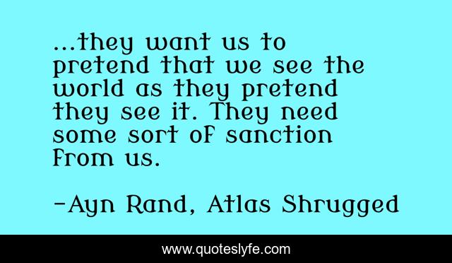 This page presents the quote "...they want us to pretend that we see the world as they pretend they see it. They need some sort of sanction from us.". Author of this quote is Ayn Rand, Atlas Shrugged. This quote is about world, atlas-shrugged, hank-rearden,.
